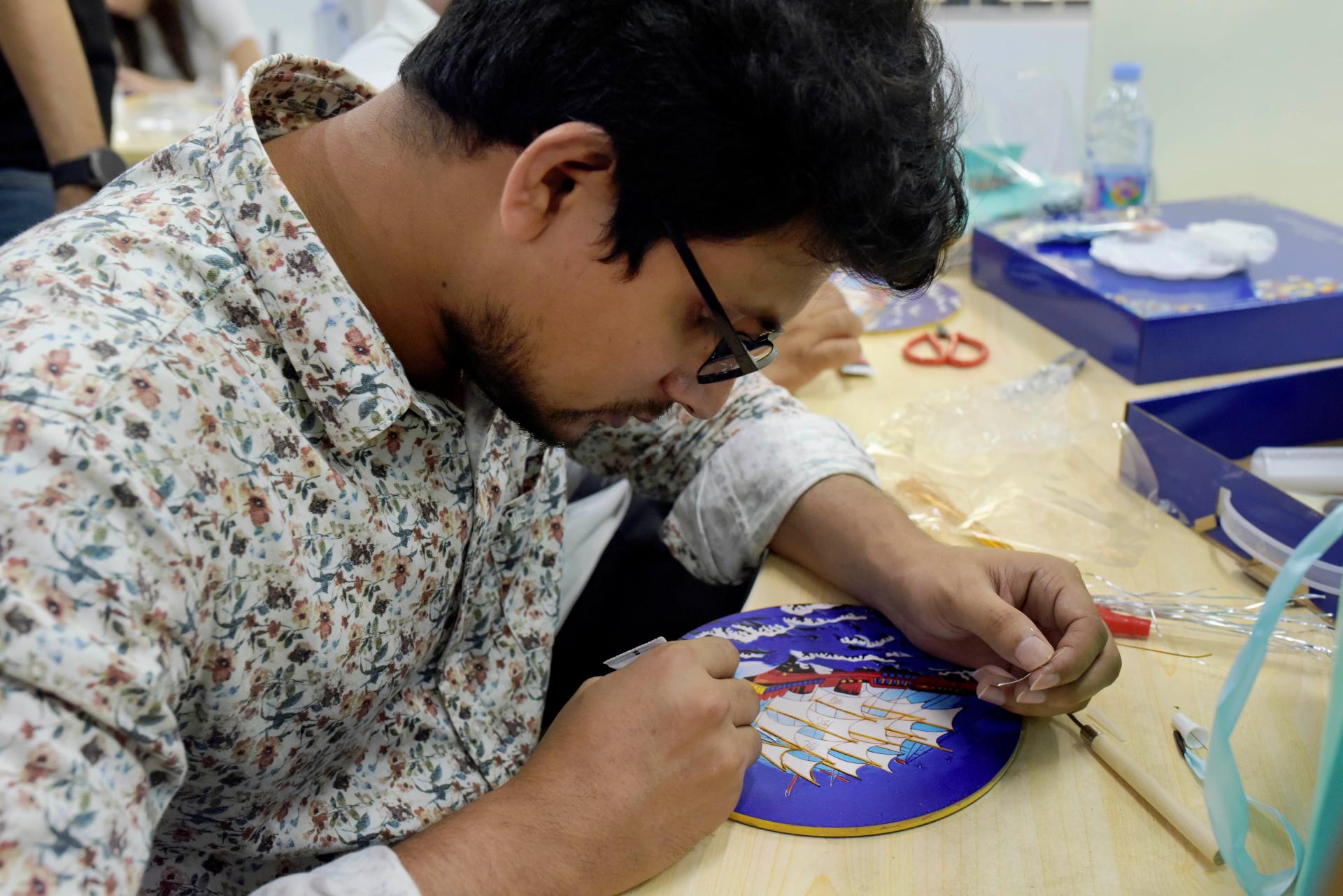 There are also intangible cultural experience sessions on the site, where international students follow non-genetic successors to make cloisonne paintings. Under the guidance of professional teachers, the students piled silk together, stacked silk, wire, wire twisting, after a while, a beautiful piece of work was completed, the students have lamented the production of cloisonne painting exquisite.