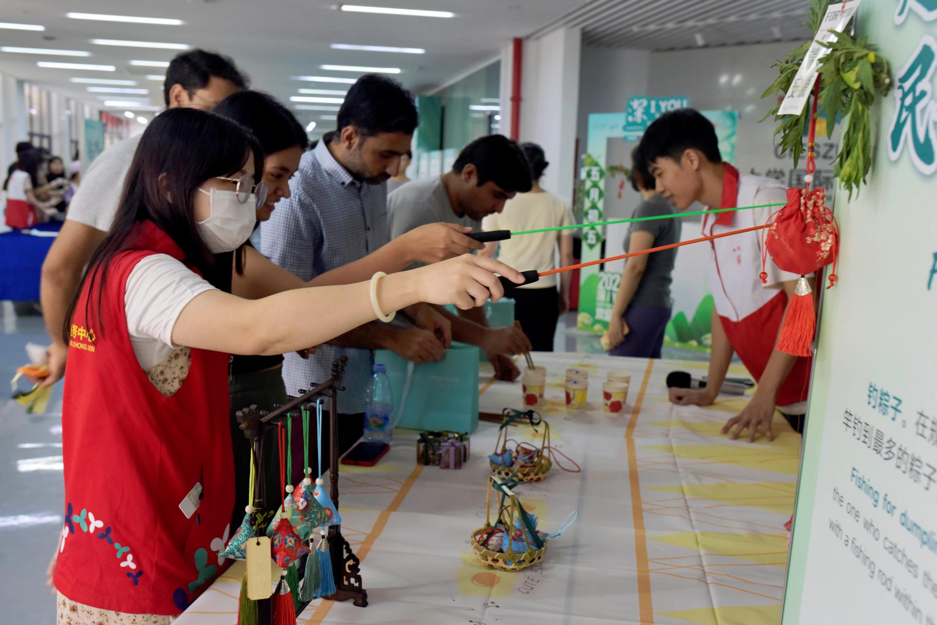 Folk games include fishing zongzi and holding coins with bamboo chopsticks. Participants are required to use chopsticks to pick up the coins, but that is not a problem for international students living and studying in China. Everyone in the game show their skills, the scene of laughter, lively.