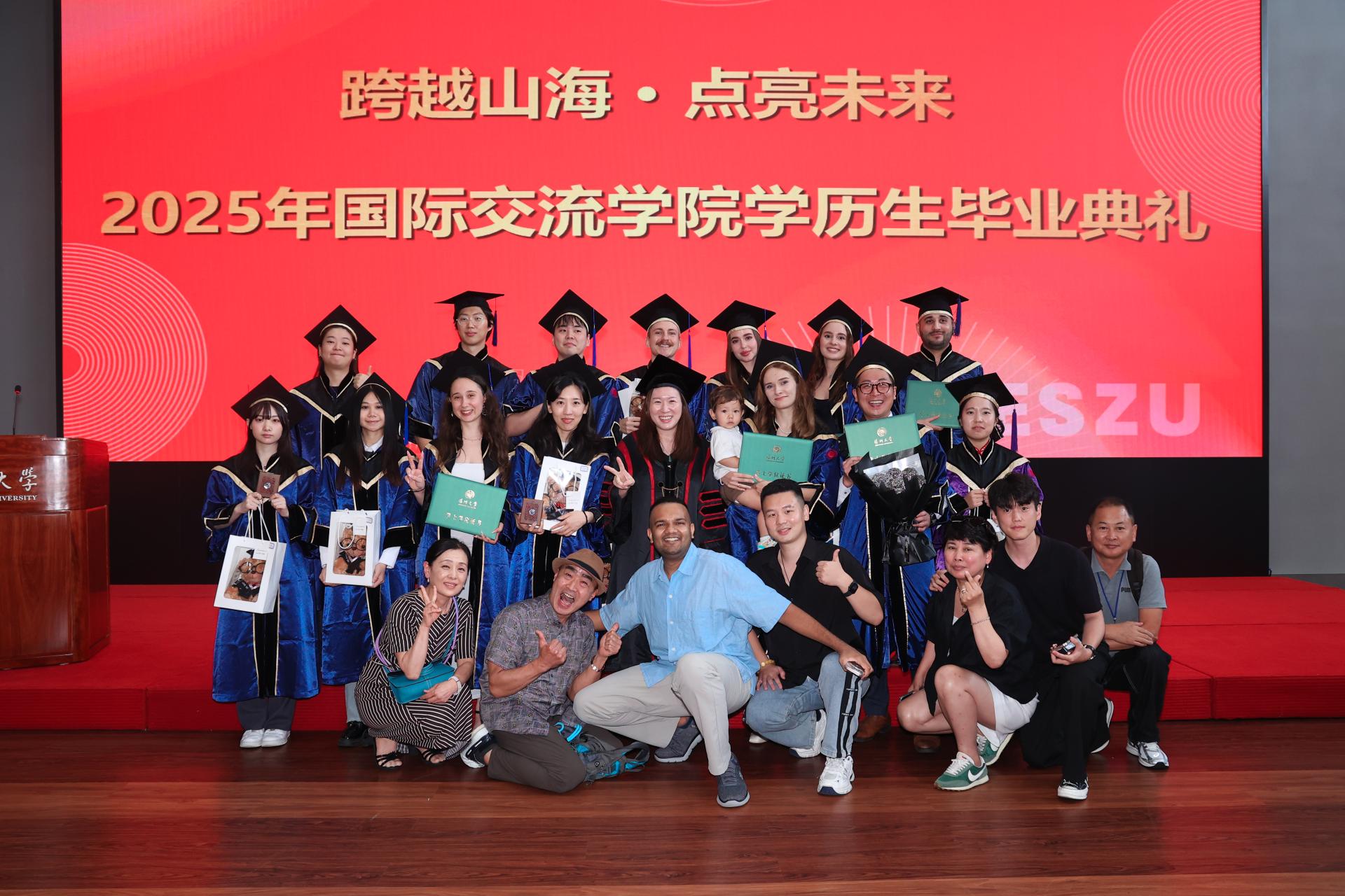 On the afternoon of June 20, 2025, golden sunlight bathed the multifunctional hall of Shenzhen University’s Alumni Square in a warm glow. Here, theCollege of International Exchange held a meticulously prepared graduation ceremony for the Class of 2025, themed “Crossing Mountains and Seas, Lighting Up the Future.”
