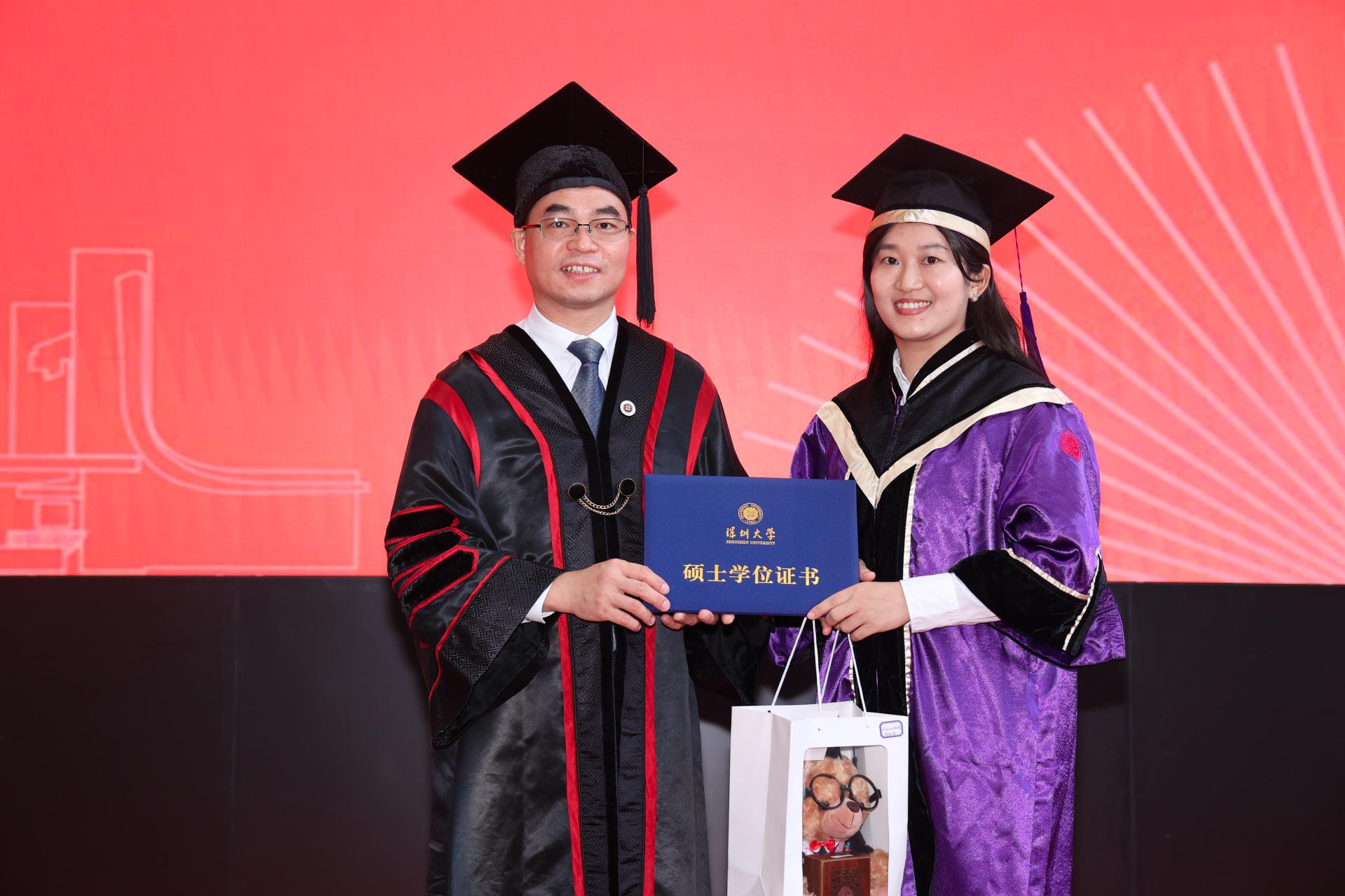 Dean Pan Yanchun stepped onto the stage with measured grace, offering his heartfelt congratulations to the graduates: "Dear students, you crossed mountains and seas to arrive here, weaving the vibrant tapestry of Shenzhen University with your youth. Today, as you embark on new journeys, may you carry our university's motto—'Self-reliance, Self-discipline, Self-empowerment'—and ride the steed of your dreams to light up the future! No matter how far you go,Shenzhen University will always take pride in you." His earnest words, weighted with conviction, stirred waves of applause.