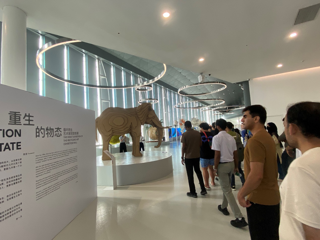 At the Circular Recycling Art Exhibition Hall, the students admired eco-artworks crafted from recycled materials like discarded plastic bottles and glass—including pieces such as the "Light Bulb Sculpture" and "Cardboard Elephant"—gaining a firsthand appreciation for the creative "waste-to-art" concept that transforms trash into treasure.