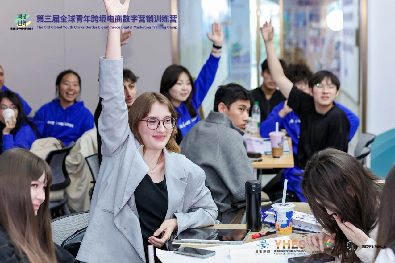 Participants enthusiastically raise their arms while taking part in an interactive session at this year’s “ISEE E-Ventures” Global Youth Cross-Border E-Commerce Digital Marketing Camp, held Saturday at the Yuehai Enterprise Service Center. Photo courtesy of the event organizer