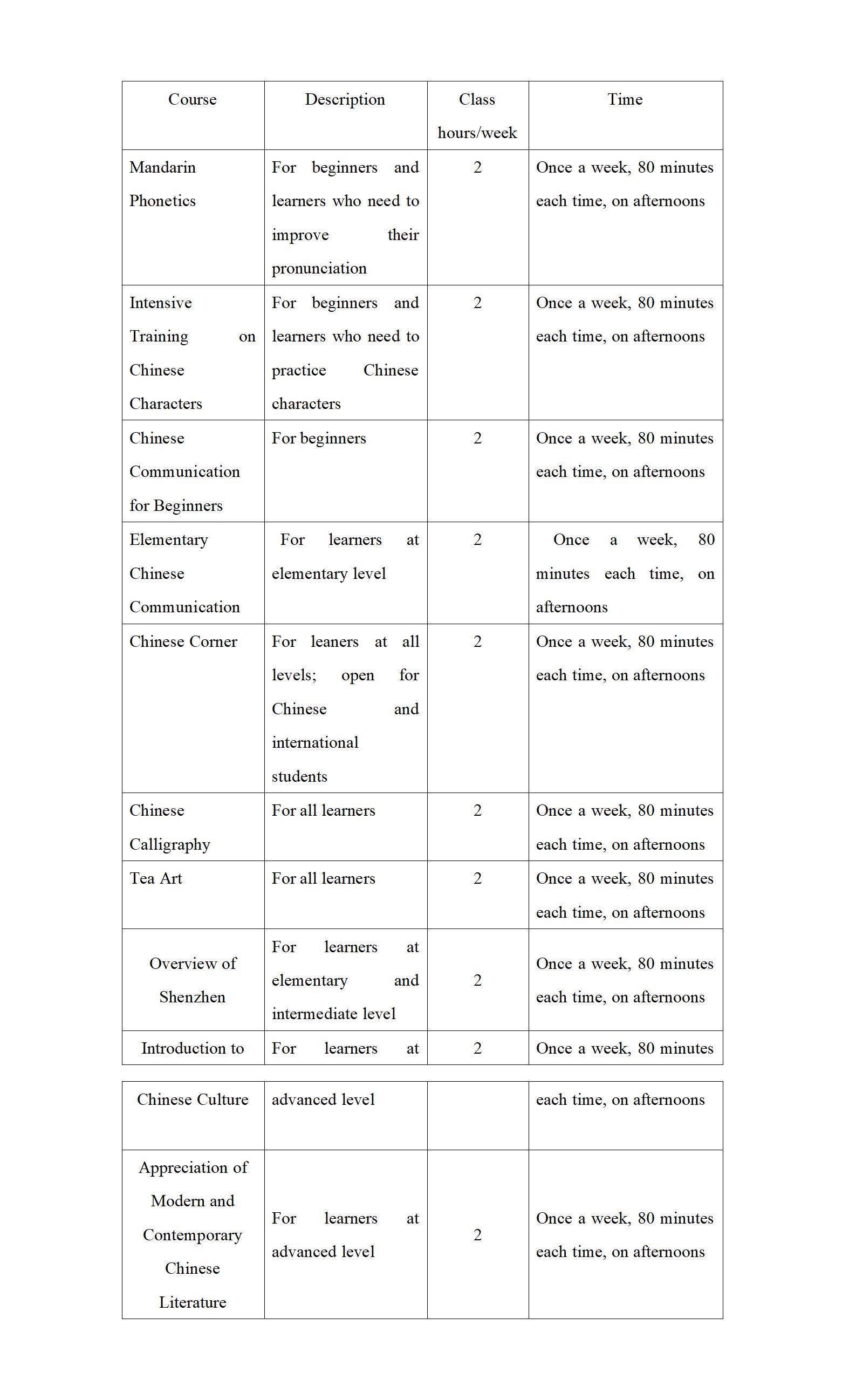 Comprehensive Chinese, Speaking, Reading and Writing, Speaking via Visual and Audio Aids, etc. to be offered based on different levels |