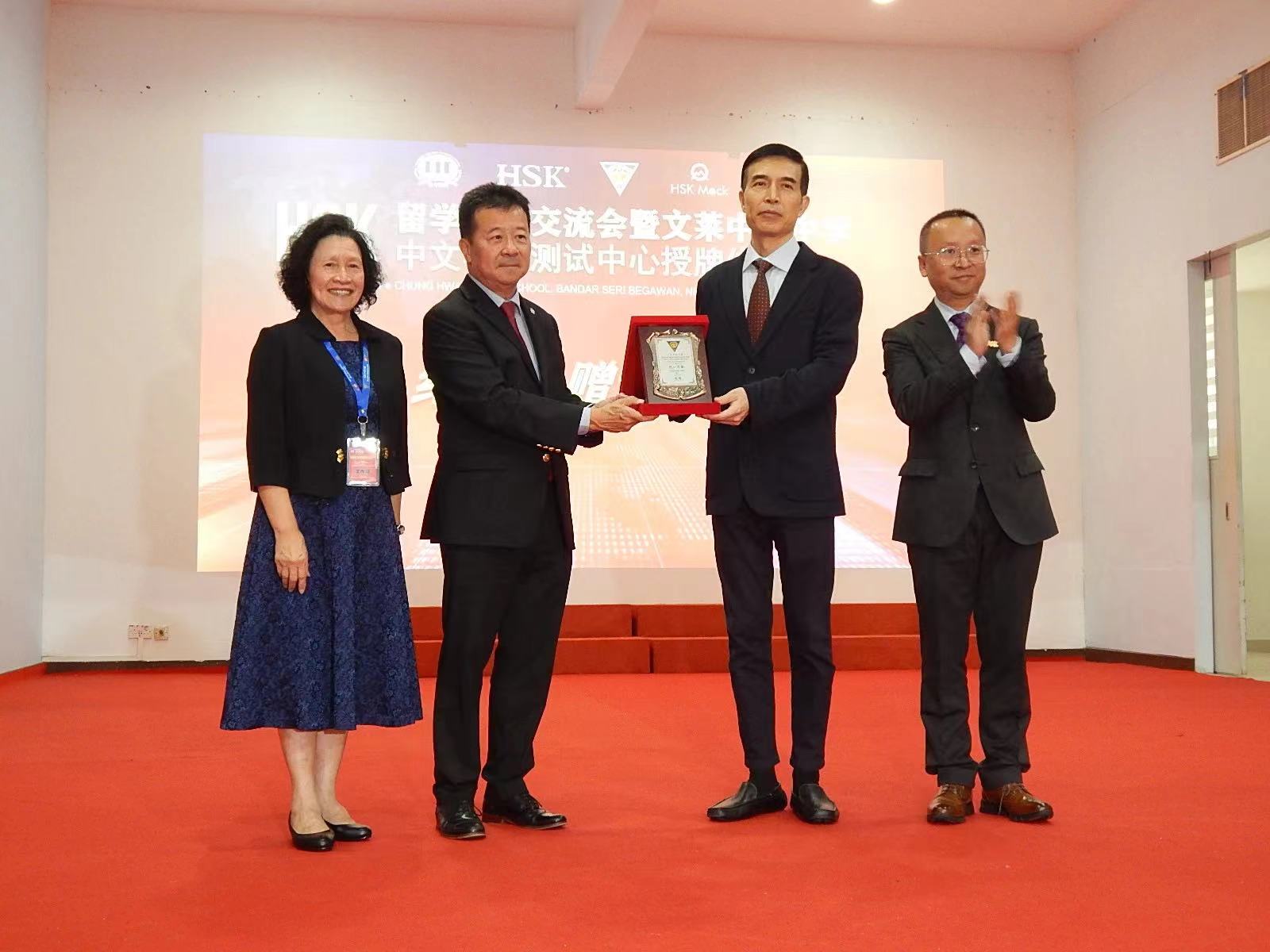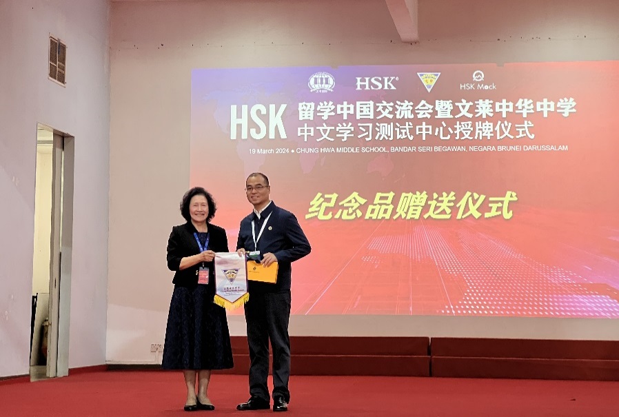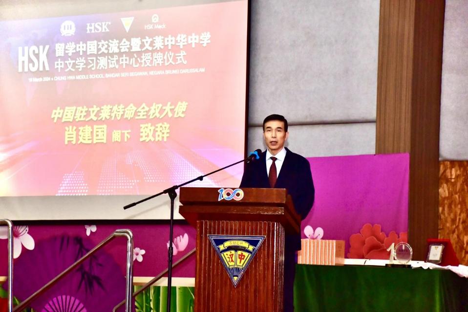 3月19日,文莱首届HSK留学中国交流会暨中文学习测试中心授牌仪式成功举办。中国驻文莱特命全权大使肖建国,文莱中华中学董事长杨德振、校长许月兰,汉考国际董事长李佩泽应邀出席并致辞,HSK留学展代表团、文莱各华校校长、师生和家长代表等约500人出席活动。肖建国大使强调中国与文莱作为近邻,友谊深厚,自1991年建交以来,两国政治互信增强,合作领域广泛。2018年建立战略合作伙伴关系后,两国关系持续稳定发展,教育领域的交流合作取得显著成果。他表示使馆愿意与教育单位和文莱华人社区紧密合作,深化两国在教育、人文等领域的交流。肖大使鼓励文莱青年通过交流会和测试中心把握赴华留学机会,亲身了解中国,成为两国友好使者。