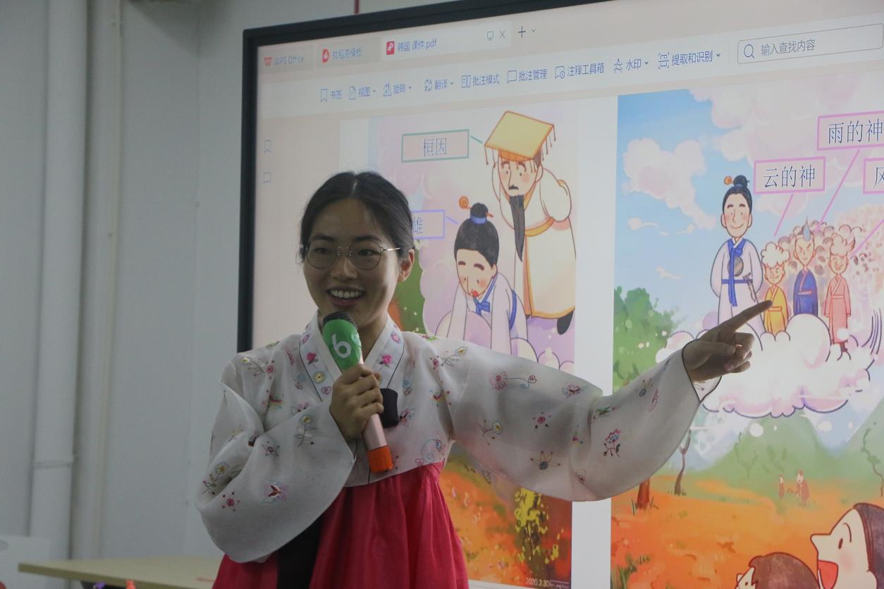 上午9:30至11:00,小班的小朋友们在韩国留学生朴志英(PARK EUN BYOL)的引导下,仿佛穿越时空踏入了迷人的韩国文化世界。朴志英的生动演绎让孩子们对韩国语言产生了浓厚的兴趣,他们不仅学会了基础的韩语问候语,还亲手用韩语写下了自己的名字,初步领略了韩国语言的独特魅力。同时,通过聆听趣味横生的故事,小朋友们还了解了古朝鲜第一代君王——檀君的神话传说,感受到了韩国深厚的文化底蕴。
