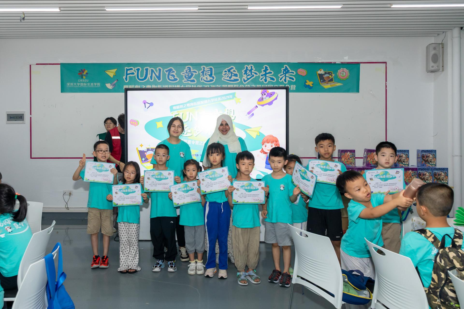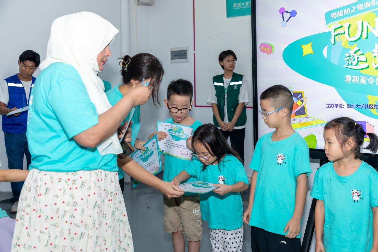 接下来,担任授课老师的留学生们,依次为每位小朋友颁发了结业证书,并与他们一同送上了精心准备的惊喜礼物。结业证书如同一部时光的纪录片,它记载着小朋友们参与夏令营的点点滴滴,见证了他们从稚嫩到成熟的每一步成长和变化。它是五天来他们努力学习、不断探索的最好证明。而那些充满心意的惊喜礼物,则是对小朋友们五天来坚持与努力的最好肯定与鼓励,寓意着他们未来的道路将充满无限可能。