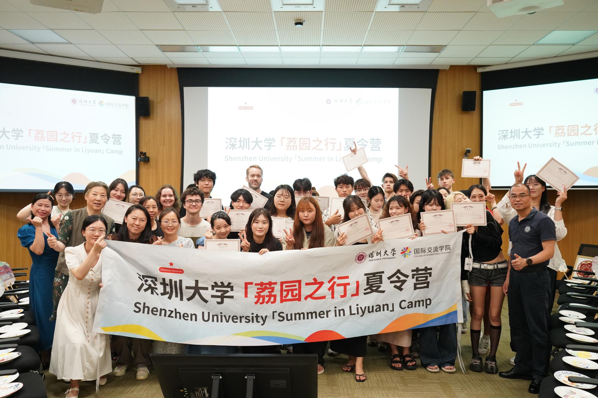 夏日炎炎,青春洋溢。2024深圳大学“荔园之行”夏令营结营典礼在汇紫楼101隆重举行。在为期两周的学习中,近30位来自世界各国的营员们齐聚荔园,学习汉语课程、体验中国文化和感受中国式现代化建设。营员们一起学习,一起探索,一起分享,跨越了文化差异,收获知识、友谊和难忘的经历。