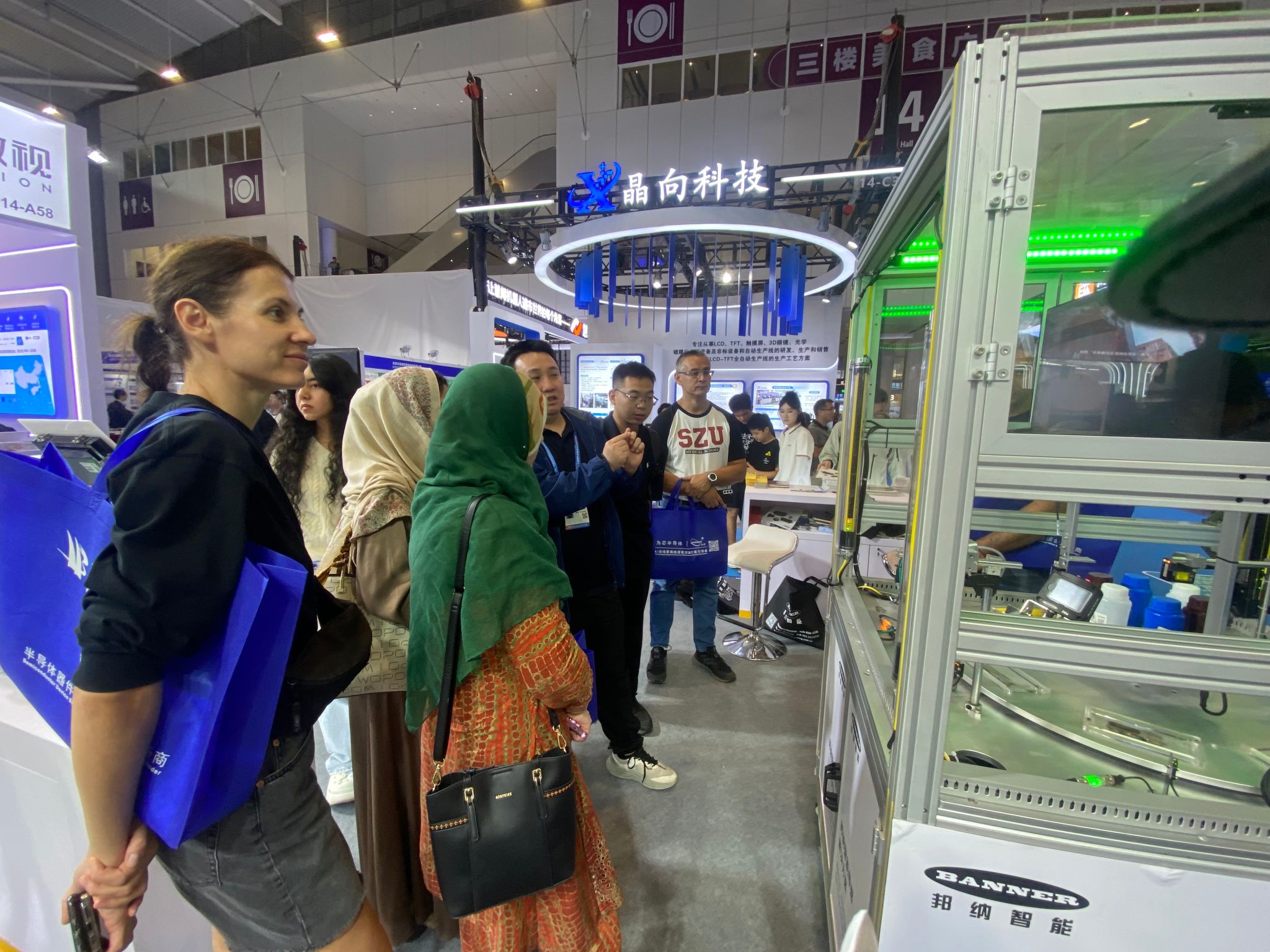 走进高交会展馆,各类尖端科技成果让人目不暇接。在晶向科技与铂纳智能的展区,精密的智能设备吸引了学子们的目光,工作人员的细致讲解让大家对中国智能制造的精度与创新有了直观认识。