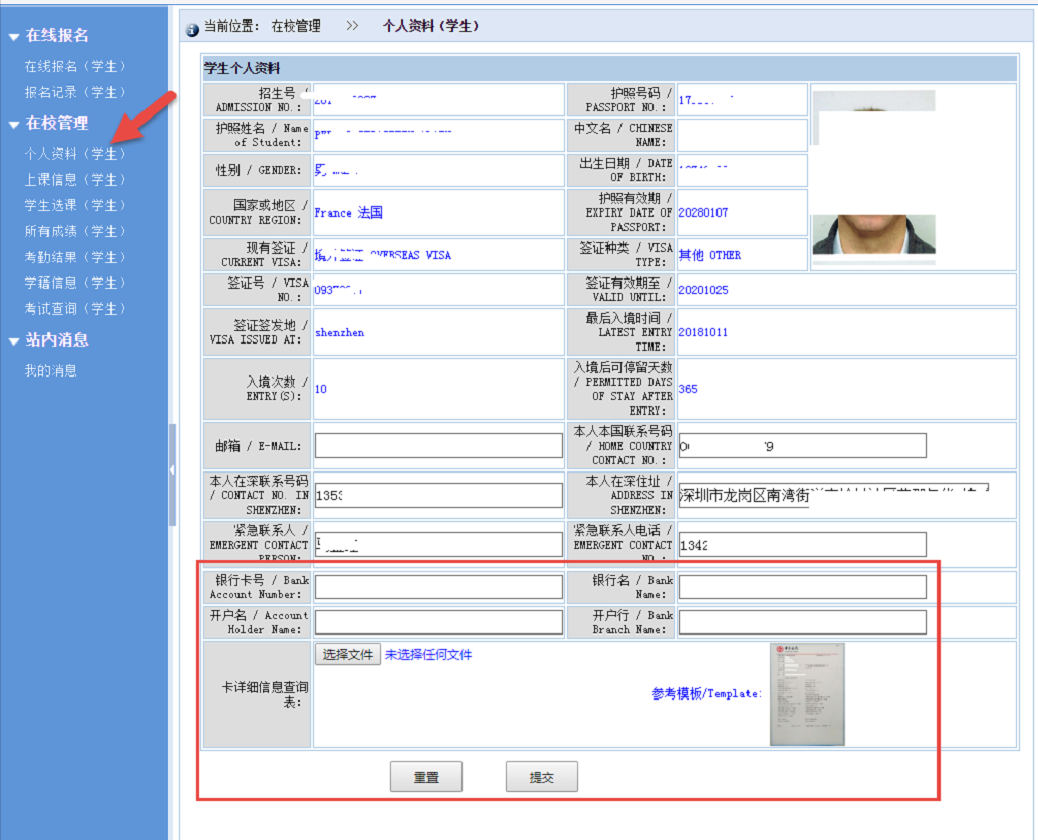 的学生,请在账户中存入足额学费的人民币,并登陆国际交流学院网站进入系统完善个人银行账户信息(如下图),等待学校扣除学费即可。