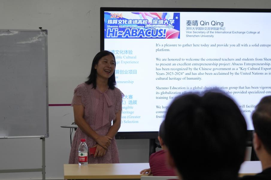 2024 年 5 月 10 日,由深圳大学国际学生发展中心发起的非遗文化进校园——珠算文化体验活动在国际交流学院顺利开展。该活动是深圳大学国际交流学院的精品留学生项目——国际学生创新创业系列活动之一。国际交流学院秦晴副书记为活动致辞,国际学生发展中心、“一带一路”国际学生双创基地负责人陈默老师代表中心,向神墨教育的老师及神墨小学员们表达了衷心感谢。