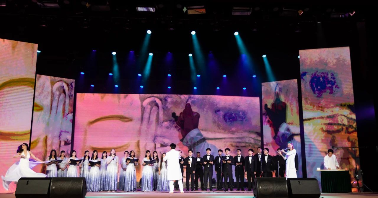 Shin Moon-sub conducts the International Choir of Shenzhen University during a performance.