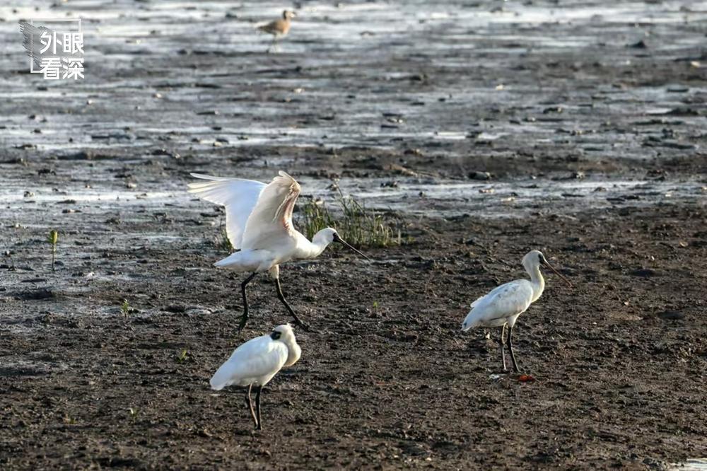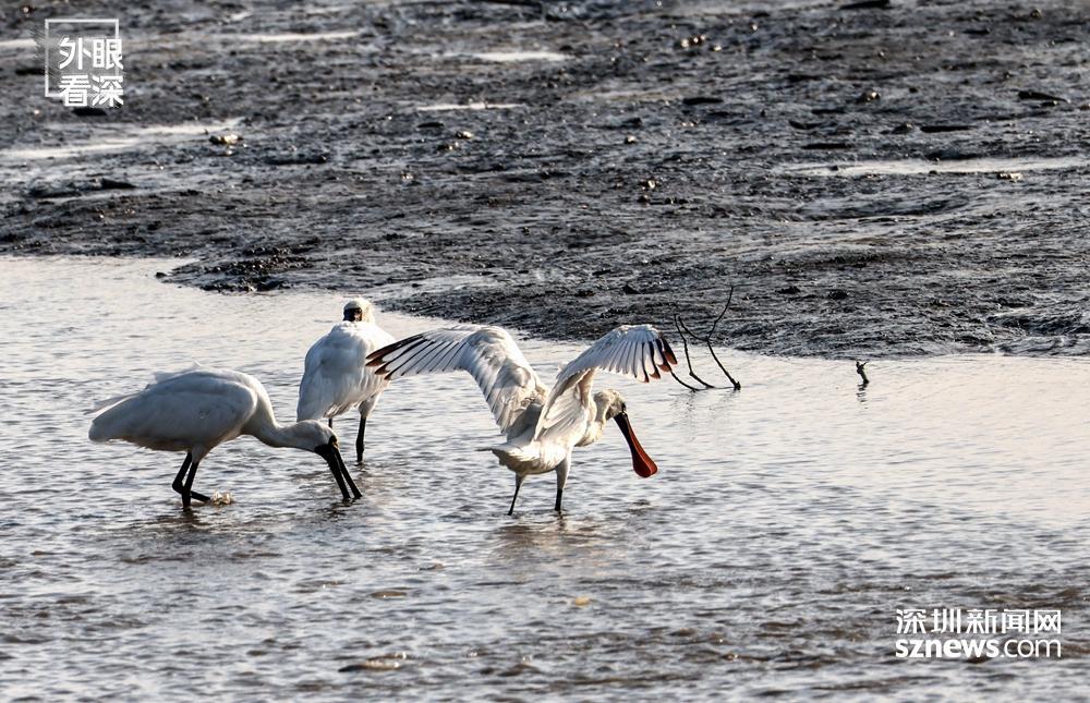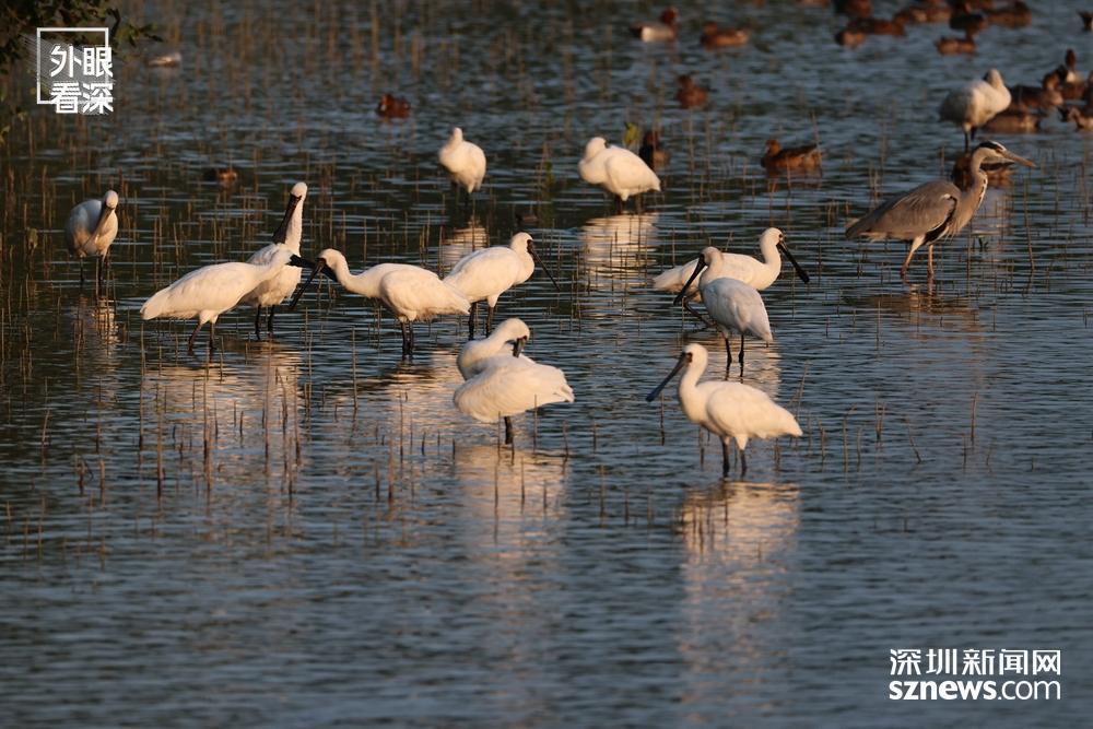 当天傍晚,大量黑脸琵鹭在深圳湾觅食,夕阳下的画面绝美。