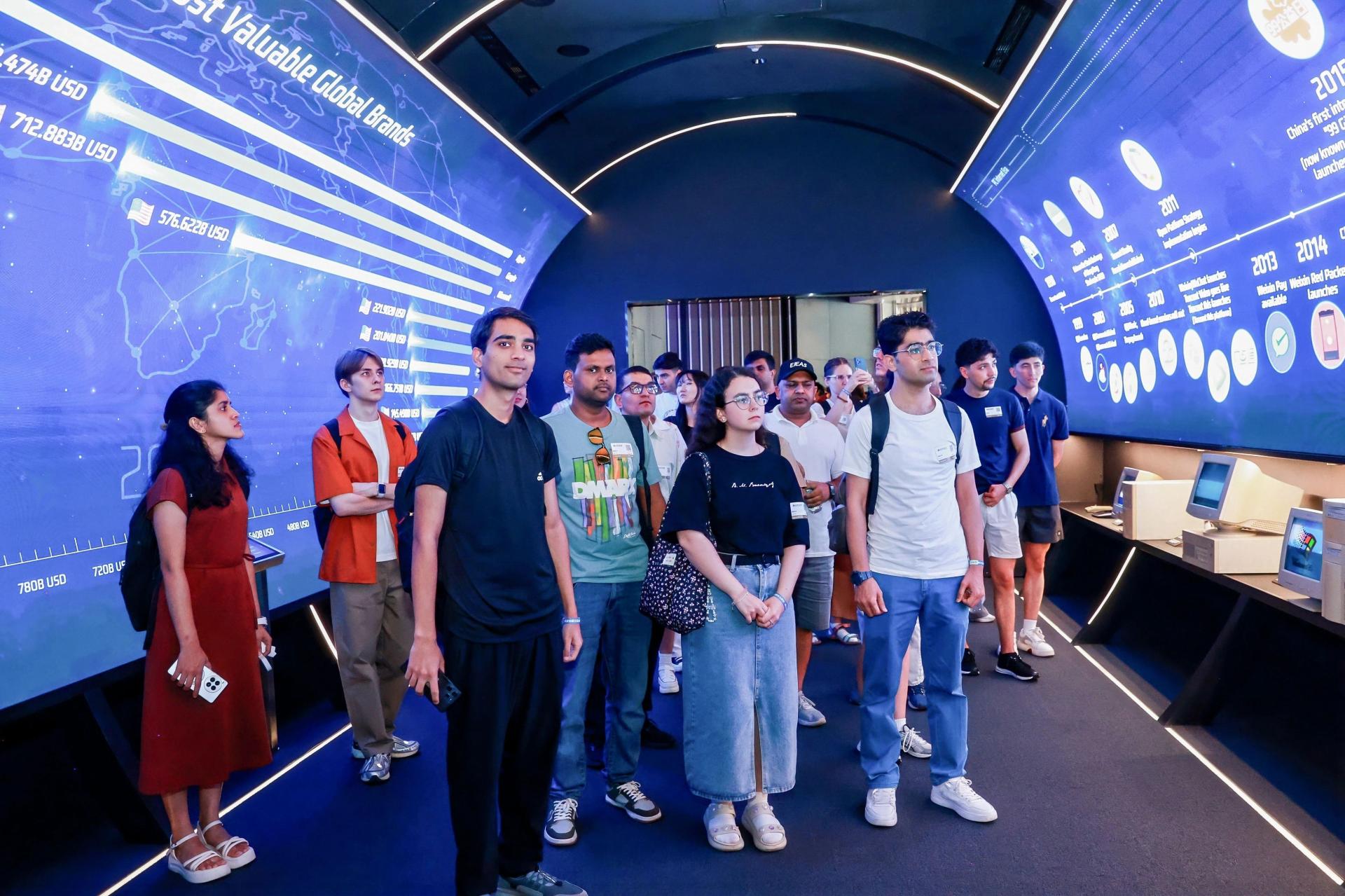 Participants learn about Tencent's development history and its product ecosystem in the company's exhibition hall.