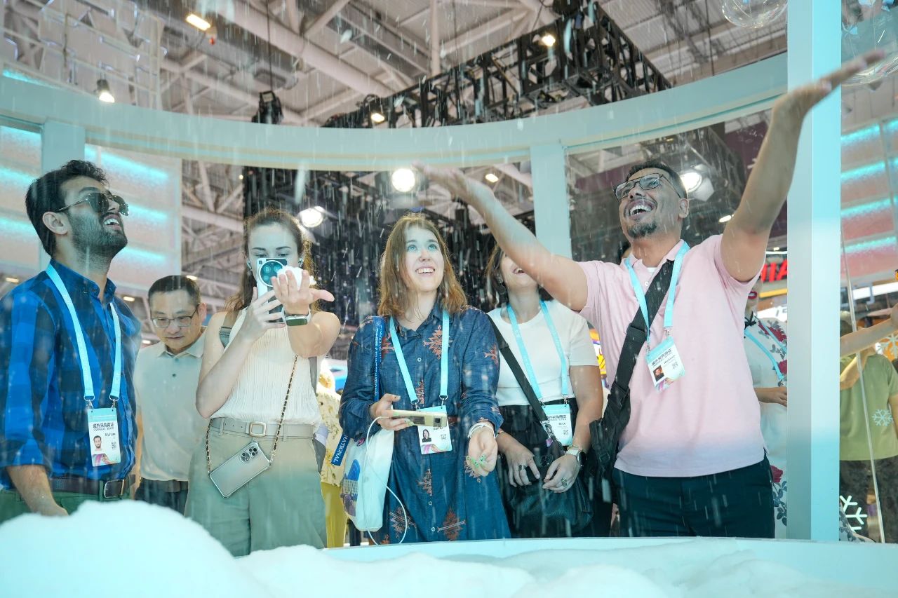 Delegation members enjoy a snowfall experience at the Huafa Snow World booth.