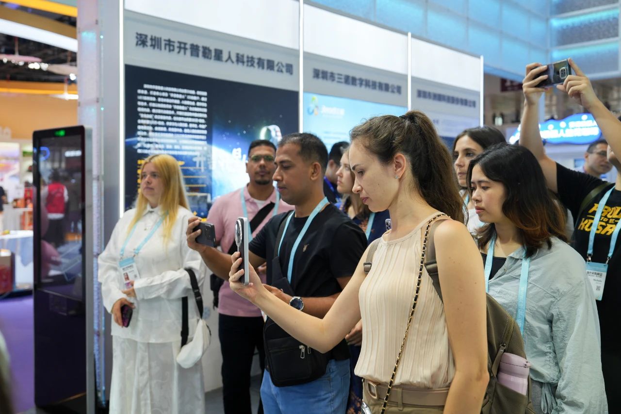 Visitors are captivated by the AI-powered photo booth presented by EyeShenzhen and Senyan AI at the Shenzhen News Group booth.