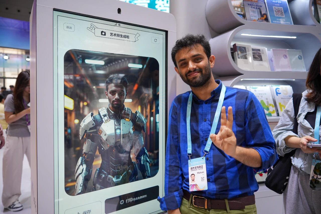 Muhammad Shahroz Khalid, a postgraduate student at Shenzhen University, poses with his AI-generated portrait at the fair.